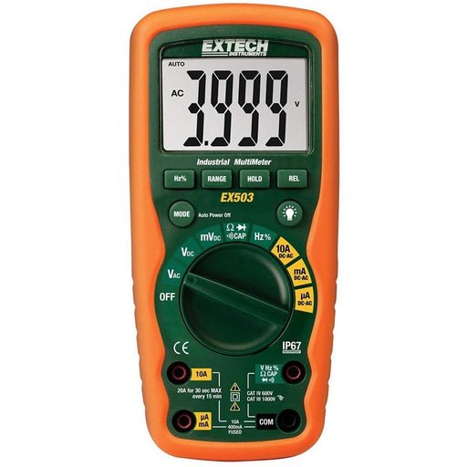 The EX503 offers an array of must-have multimeter measurements including capacitance, frequency (dual sensitivity for electrical and electronic applications), diode test and continuity. Other features include Data Hold and Relative Hold, and manual- or auto-ranging modes. The latter automatically adjusts the measurement range based on the detected source such as electrical components and electronic equipment. The meter features 0.5 percent accuracy and a CAT IV-600-volt safety rating, protecting users even on outdoor wiring. Includes EX503 heavy-duty digital multimeter, double-molded test leads, magnetic hanging strap, 9-volt battery, carrying case, and user manual.